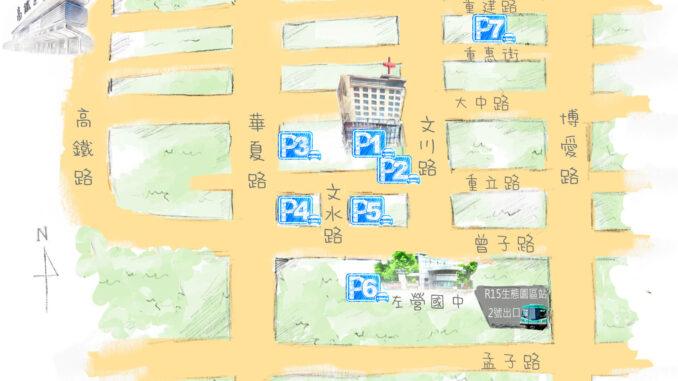 P6: 左營國中租用停車場,主日開放。(需憑證才可免費停車)