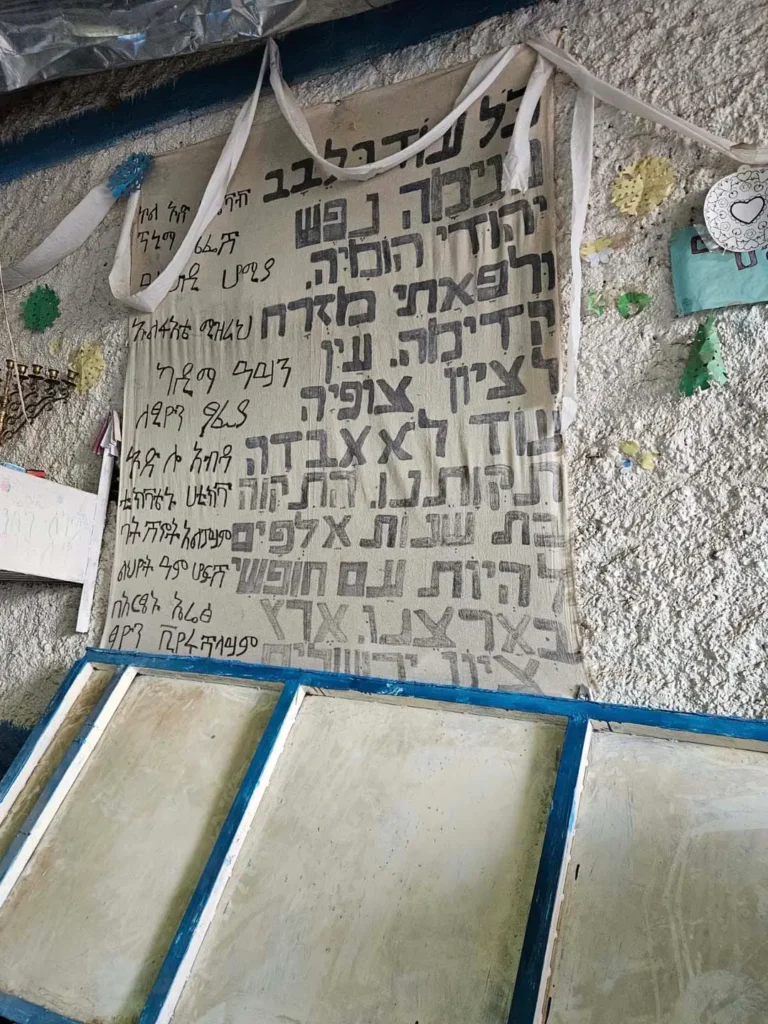 所有的見聞都令我感到震撼。當地猶太會堂的屋頂和牆壁以波紋鐵皮搭建,內部則鋪掛著防水帆布和五顏六色的布料。一塊深褐色的布上繡著紀念在前往蘇丹途中喪生的親人名字。用泥土鋪成的地面延伸至後院,在那裡設有一座猶太浸禮池(mikveh),與一間沒有自來水的簡陋廁所。