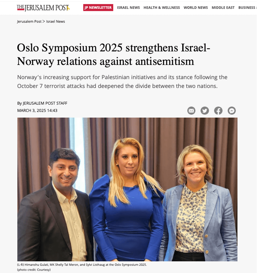 在如此困難的背景下,2025年奧斯陸研討會成為與猶太國家和人民團結一致的有力宣言。其中一項重要進展是「挪威議會的以色列之友聯盟」(Israel Allies Foundation Stortinget,註:「Stortinget」指的是挪威議會)的成立,此團體將與位於耶路撒冷的「以色列國會基督徒盟友核心小組」(the Knesset Christian Allies Caucus )成為合作夥伴。該聯盟由挪威議員希曼.古拉帝(Himanshu Gulati)領導,將挪威與全球超過50個類似的政府聯盟網絡聯繫起來。來自以色列的議員雪莉.塔爾.梅隆(Shelly Tal Meron)與以色列國會基督徒盟友核心小組兼以色列之友聯盟(Israel Allies Foundation)主席喬許.萊因斯坦也出席了這場活動。