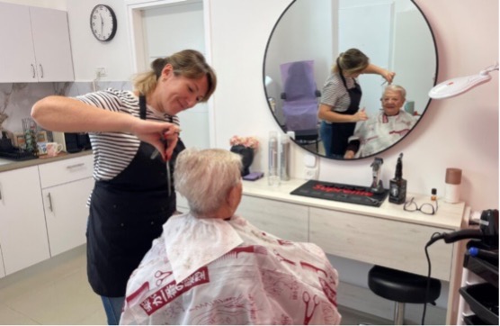 海法之家的居民在裝修精美的美容沙龍整理頭髮。