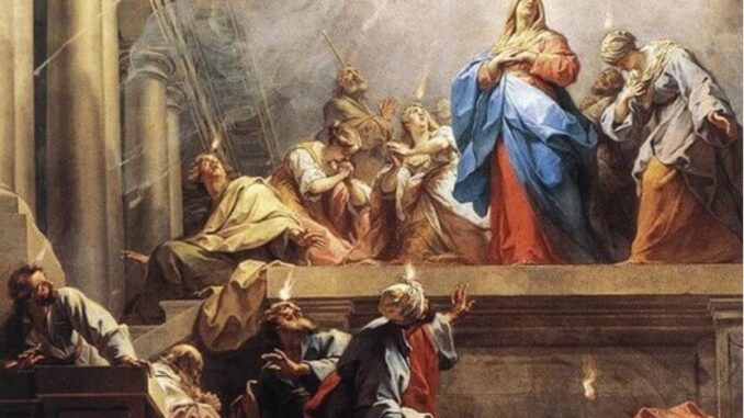 五旬節到了,門徒都聚集在一處。忽然,從天上有響聲下來,好像一陣大風吹過,充滿了他們所坐的屋子,又有舌頭如火焰顯現出來,分開落在他們各人頭上。他們就都被聖靈充滿,按著聖靈所賜的口才說起別國的話來。
