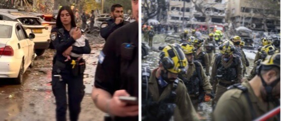 左圖:以色列女警抱著從伊朗飛彈襲擊之廢墟中救出的嬰兒。(照片來源:以色列警方) 右圖:以色列救援隊在遭伊朗飛彈襲擊的建築廢墟中進行救援。(照片來源:AP)