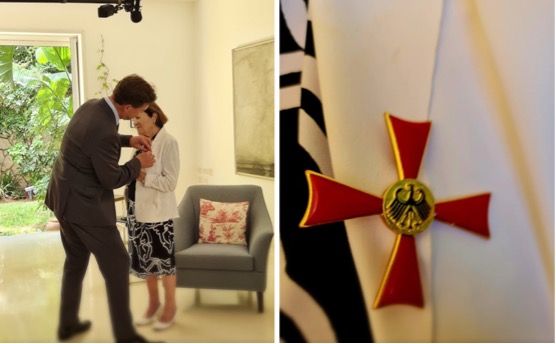 5月23日(週五),ICEJ同工雅妮.托賀(Jannie Tolhoek)應邀陪同大屠殺倖存者伊娃.厄本(Eva Erben)與其家人前往德國駐以色列大使史蒂芬.塞伯特(Steffen Seibert)的官邸,參加一場特別的頒獎儀式,塞伯特大使代表德國政府向伊娃授予德國聯邦十字勳章(Federal Cross of Merit),以表彰她多次在ICEJ德國分部的安排下,前往德國公立學校向學生講述她作為大屠殺倖存者的經歷以及當前反抗反猶主義的成果。