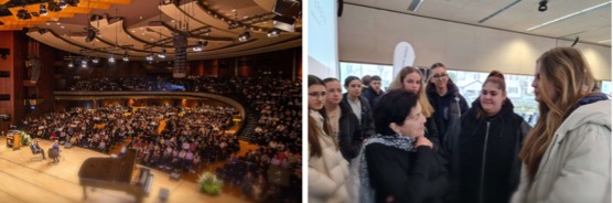 左圖:伊娃在德國向滿座的聽眾發表演說。 右圖:伊娃與德國學生進行交流。