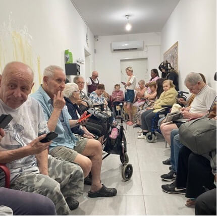 戰爭並沒有停止海法之家的生活。雖然警報聲此起彼落、人心惶惶、空氣中瀰漫著緊張的氣氛,我們仍平穩地持續維持日常的節奏。希伯來文課程仍在進行著,這讓長者們有了目標和前進的動力。玩賓果遊戲時的笑聲短暫舒緩了外面世界帶給他們的沉重感,並物理治療課也能夠讓他們的身體保持活動與體力。每天中午大家仍聚在一起共餐,這份陪伴能夠增進彼此的聯繫,又能恢復規律的日常生活步調。