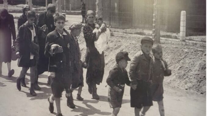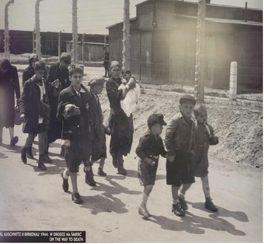 猶太兒童在抵達奧斯維辛集中營後的2至3小時內即被屠殺,圖中所見,是他們在不知情的情況下,走向死亡之路的身影。