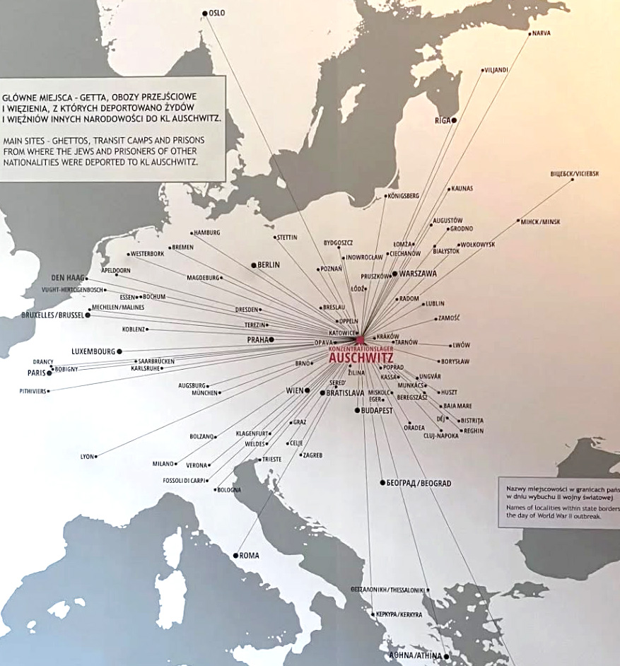 這張圖描繪了二戰德國納粹將散居在歐洲各地的猶太人,系統性地分批送往奧斯威辛集中營,突顯了當時的迫害規模與組織性。