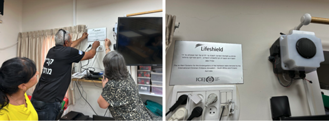 每所幼兒園的各年齡層班級都配備專用的警報系統(共46個),全數由ICEJ芬蘭分部和ICEJ南非分部捐贈。這些警報系統安裝與啟動後,ICEJ慈惠事工和回歸部副總裁妮可.尤德(Nicole Yoder)放置了一塊落成牌匾,以展現世界各地基督徒朋友對當地以色列居民的關愛。