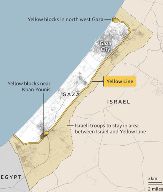 納坦雅胡在最後一刻修改了川普計劃的內容,確保以色列國防軍從加薩新劃定的「黃線」後的撤出範圍,與哈馬斯解除武裝的進度成正比。第一階段結束後,以色列仍控制加薩53%的地區,包括拉法過境點(Rafah Crossing)與「費城走廊」(Philadelphi Corridor),以阻止哈馬斯重新武裝。此外,以色列國防軍還掌控整條薩拉赫丁公路(Salah al-Din Highway),這是貫穿加薩的主要南北幹道。以色列也堅持該協議保證在哈馬斯的控制區內不得進行任何重建工程。此外,以色列擁有決定權,批准哪些國家能派遣部隊進入加薩國際穩定部隊。所有這些條款都對以色列極為有利,而阿拉伯各方在支持川普計劃時也接受了這些條款。
